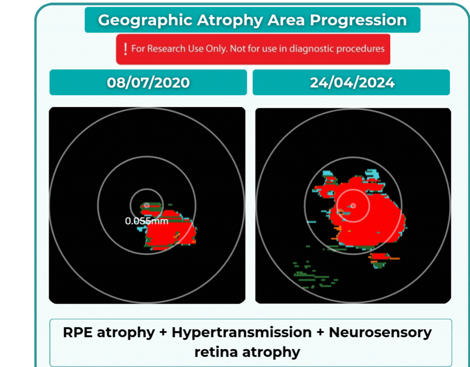 The GA Progression feature provides tools for research-oriented visualization and comparison of OCT imaging data across multiple visits. Users can review changes in areas associated with geographic atrophy (GA) and related imaging features through percentage-based displays, maps, and graphs.